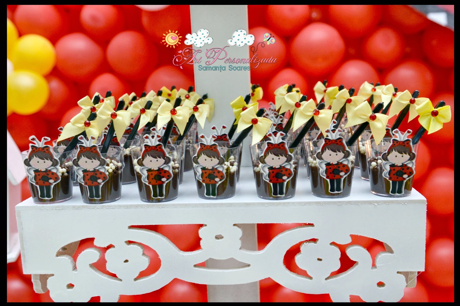 Push Cake Pop com gominhas e as garrafinhas de água mineral nas cores azul e vermelha